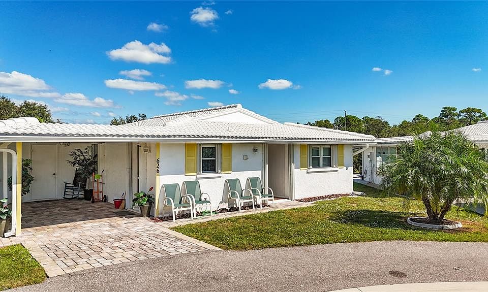 Move-In Ready & Maintenance-Free Living in Circle Woods of Venice! Welcome home to this charming freestanding 2-bedroom, 2-bath villa with a carport, ideally located on a quiet cul-de-sac near the community clubhouse. Enjoy peace of mind with new flooring and fresh paint throughout, a 2-year-old roof, a brand-new refrigerator (2025), and accordion hurricane shutters for quick storm preparation. Step inside to discover a bright kitchen featuring a breakfast bar, pantry, and a convenient pass-through to the dining room. The dining and living room combination creates the perfect open layout for everyday comfort or entertaining guests. A sunny Florida room adds extra living space, ideal for reading, relaxing, or enjoying your morning coffee while overlooking the landscaped surroundings. The spacious primary suite includes a walk-in closet and private bath with a walk-in shower, while the guest bedroom also offers a large walk-in closet and nearby bath with a tub/shower combo. From the carport, the attached storage closet doubles as the laundry area, providing added convenience and functionality. Circle Woods of Venice is a maintenance-free community offering two pools, a clubhouse, bocce ball, shuffleboard, and horseshoes—all just minutes from Venice and Manasota Key beaches. With no age restrictions and an active social atmosphere, this is the perfect place to start living the Florida lifestyle you’ve been dreaming of.
