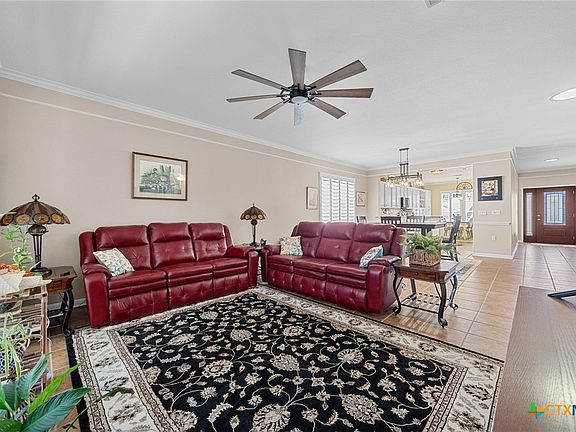 Discover the perfect blend of comfort and convenience in this beautifully maintained home in the sought-after Sun City, Texas community. This stunning Andover model features an inviting open floor plan with abundant natural light, high ceilings, and elegant crown molding. The spacious living area boasts a modern ceiling fan and large windows with custom plantation shutters, creating a warm and welcoming atmosphere.