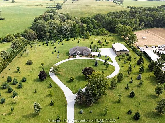 Attention discerning Buyers: A property like this is extremely RARE - No detail was left untouched on the design and materials used for this stunning custom built 4 bedroom, 4.5 bathroom Rancher! Nestled on a treed, 11.5-acre lot just 2 minutes from town, this property includes certified wildlife gardens, 2.5 acres of natural woodlot, 67 tree varieties including apple, pear, plum, and cherry and...endless privacy and serenity. Inside, a welcoming foyer with gorgeous ceiling details opens to the gourmet kitchen with a 10x5 granite and aged maple island, and high end appliances including gas stove. Details impress throughout—7” wide plank hardwood, 10’ ceilings and crown moulding, Hunter Douglas California shutters, 8’ doors, a floor-to-ceiling stone gas fireplace surrounded by more gorgeous custom cabinetry, and a wrought-iron wine cellar. Large windows and doors lead to a covered stamped concrete deck with outdoor fireplace, perfect for gatherings, relaxation, or even a future pool or hot tub. The Primary bedroom retreat features garden doors, a custom walk-in closet, and a spa-like ensuite with floor to ceiling porcelain walk-in shower, clawfoot tub, dual basins, and private water closet. A versatile 2nd bedroom/office with built-ins, walk-in pantry, laundry/mudroom, and powder room complete the main floor. The custom spiral maple staircase leads to the finished lower level with 2 large bedrooms with oversized windows—each with walk-in closets and ensuites—plus a recreation room, home theatre, utility space, garage entry, and more storage. The impressive 88’ x 48’ shop offers 3 oversized doors; 1 section with full insulation, temperature control, and a 3-piece bathroom. Ask for the list of extras and custom features—this property is truly one of a kind and an investment that offers endless possibilities.