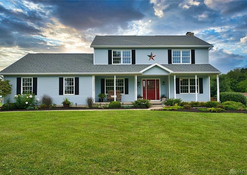 Simple, clean country living right here in Greene County! Soak in the stunning sunsets from the expansive front porch or covered rear deck, your choice. Cross the threshold of this traditional style home w/beautiful, hardwood fl throughout the main level, to the right is the living room, right is the office/library, craft space, etc. The entire rear of the home offers expansive views of the 3acre parklike setting from the kitchen w/large wall pantry or the dining room wall of windows w/wbfp for those cozy upcoming evenings (fireplace not warranted). Sliding Pella doors lead to the covered deck, and fenced yard (approx .5acre). Upstairs 4 spacious bedrooms including a primary bedroom featuring a walk-in closet, dual vanity, soaking tub and shower. Full basement, partially finished, w/wbfp (not warranted) the real treat remains outdoors with the expansive 6 car garage (3/3), insulated and heated, perfect for toys, projects, etc! Enjoy sweeping views from all angles on this property.