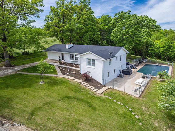 Escape to your own countryside retreat ideal for HORSES & other loved animals,just beyond city limits on blacktop road.. A number of amenities including a five-stall barn with both indoor and outdoor arenas, fans in each stall, high insulated ceilings; a serene inground 40'x20' pool + a relaxing hot tub; a fully stocked lake & a private fenced backyard perfect for outdoor gatherings. Inside, enjoy the charm of Hickory cabinets and a stylish tile backsplash in the beautifully remodeled kitchen open to spacious living room with a bay window providing an inviting space for entertaining. Wall heating unit in dining area adds extra touch of coziness to the new HVAC electric heat pump on those coldest winter nights. Private entrance to separate living area with 1/2 batch provides so many options heated & cooled by baseboard heat & window unit. Also has door to fenced backyard.