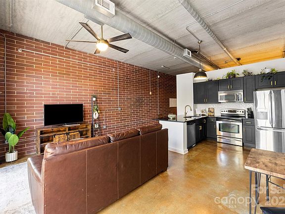 The kitchen boasts stylish black shaker cabinetry, granite countertops, a white herringbone backsplash, and gold fixtures, complete with a LG fridge (2025) and 7-ft peninsula for counter seating. The full bathroom has been tastefully updated with white tile, convenient shampoo niches, and a spacious vanity with gold and matte black accents throughout. Additional features include multiple closets finished with closet systems and a laundry closet equipped with a washer & dryer combo. You'll also enjoy the convenience of an assigned parking spot and secure building entry with an elevator. This prime location offers easy access to Uptown, I-277, the light rail & gold line, Camp North End, Optimist Hall, and much more. PLUS, the building is friendly to both short and long-term rentals! Don’t miss your opportunity to explore 626 North Graham!