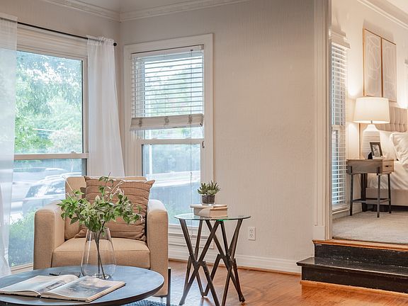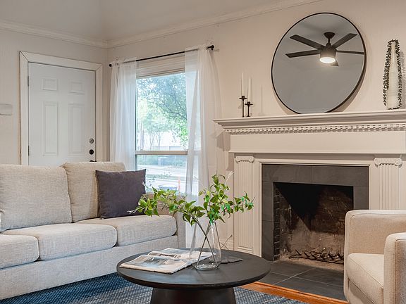 The living room centers around a classic fireplace and opens to a large formal dining area designed for easy entertaining. The updated kitchen features an accent ceiling, stainless steel appliances, and eye-catching tilework that complements the home’s historic character.