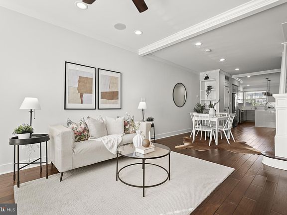 Discover the best of city living in this stunning Building Character renovation, complete with 7 years remaining on the CHAP tax credit—a rare opportunity for long-term savings. Inside, you’ll find soaring ceilings, exposed brick, crown molding, and gleaming hardwood floors that create a warm, sophisticated feel. The spacious living room flows into the dining area, highlighted by custom built-ins perfect for display or audio equipment. At the heart of the home, the chef’s kitchen features a dramatic waterfall quartz island with seating, 42” soft-close cabinetry, subway tile backsplash, quartz counters, and premium stainless steel appliances—an ideal space for both daily living and entertaining. The upper level boasts a luxurious primary suite with a walk-in closet, recessed lighting, hardwood flooring, and a spa-like en-suite bath with dual vanities and a glass-enclosed shower with dual shower heads. A second bedroom with vaulted ceilings and exposed brick has easy access to a designer hall bath with rain shower. A convenient laundry closet completes this level. From here, head up to the private rooftop Trex deck with panoramic skyline views, the perfect spot for entertaining or relaxing. The fully finished lower level offers incredible flexibility with a third bedroom, full bath, private office, or optional fourth bedroom, plus extra storage space. Additional features include a whole-house audio system for a truly modern lifestyle. Outside, enjoy the convenience of a private TWO CAR parking pad, a true city luxury. With unmatched craftsmanship, high-end finishes, and an unbeatable Brewers Hill location near I-95, I-895, and I-83, this home is a rare find you won’t want to miss!