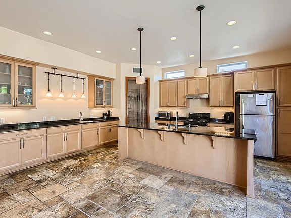 - Bar, Ceiling Fan, Kitchen Island, Open Floor Plan, Pantry, Recessed Lighting, Remodeled Kitchen, Shower
