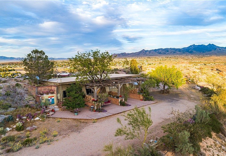 WELL-HIDDEN, REPURPOSED WATER RESERVOIR HOME!!! This UNIQUE, alternatively built home is nestled on top of a plateau on .63 acres halfway under the ground and constructed from a repurposed water reservoir with durable 8-INCH-THICK concrete walls!!!! The property includes 3 additional scenic parcels for an aggregate total of 1.32 acres near Historic Route 66 in Kingman, Arizona! As you approach from paved Jefferson Street, you'll be stunned by the 360-degree views of the Hualapai Mountains, nearby plateaus, bluffs, and mesas. Colorful desert landscaping lines the wrap-around driveway and rock formations greet you as you explore this custom and artistic property. An inviting covered front porch with a cozy porch swing leads you into the home, where you'll find yourself in an artistic studio. The kitchen was built with custom cabinetry, a 2-burner cooktop stove and woodwork accents. The home features rustic wood ceilings and a wood stove for cozy heating. You'll notice the bathroom is conveniently located right off the living room, which features a walk-in shower. The garage/office space enjoys masonry accents and adds even more living space to the home with a loft, cabinetry, stainless steel sink with propane cooktop and a custom Whirlpool freezer/refrigerator. This alternatively built home is sustainable, as it comes with a greenhouse. Imagine entertaining friends here, or taking in the incredible sunrises and sunsets the desert is known for. This unique and solitary property seems hidden and unknown yet is only minutes away from all the attractions of downtown Kingman and Historic Route 66! Owner may finance with 30% down for up to 15 years.