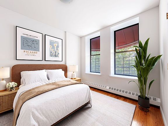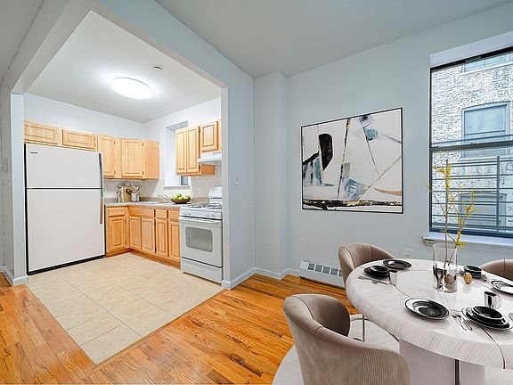 This roughly 1000 square foot home offers excellent light in the master and junior bedroom through northern exposure overlooking 136th St. The spacious living room of almost 200 square feet allows for a full entertainment setup. The renovated kitchen has excellent cabinet space and a separate dining alcove with room for a six-person dining table. Hardwood floors throughout.