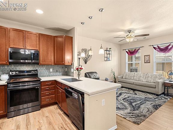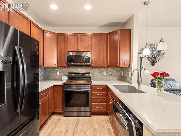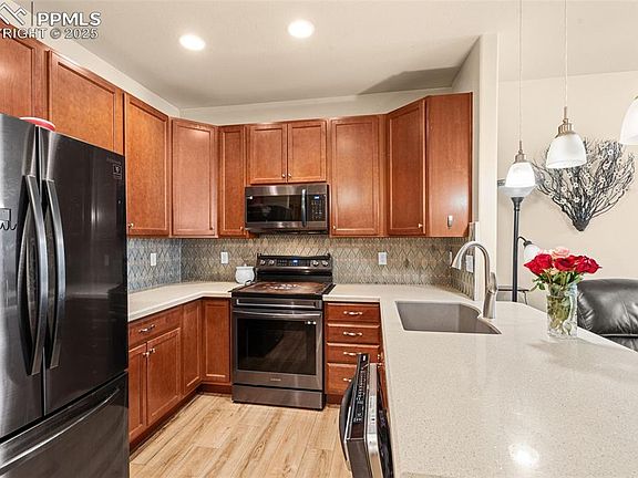 Welcome to this beautiful 2-bedroom, 2.5-bath townhouse nestled in the heart of Colorado Springs’ sought-after Norwood neighborhood. Offering 1,500 square feet of thoughtfully designed living space, this home is perfect for first-time buyers or anyone seeking low-maintenance living in a walkable, convenient location. Step inside to discover a stylishly updated kitchen featuring granite countertops, double sinks, a sleek tile backsplash, and modern black appliances—all renovated just three years ago. The main floor boasts new wood flooring, while plush carpet adds warmth to the upstairs bedrooms, hallway, and stairs. The bathrooms and laundry room also feature updated hard surface flooring for easy care.