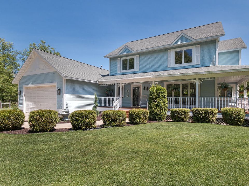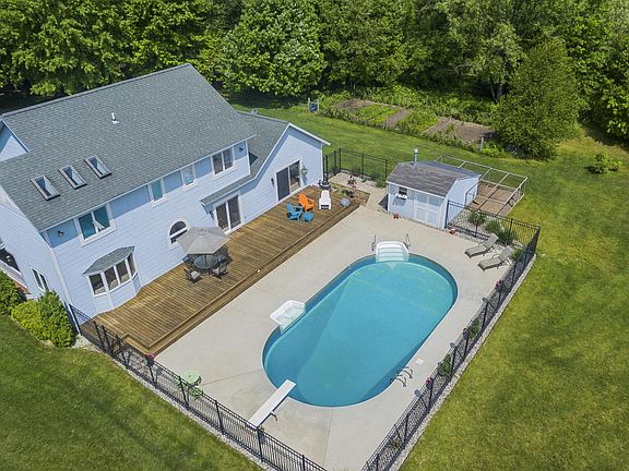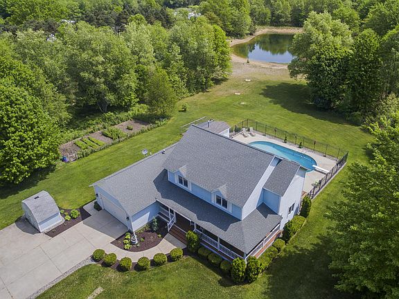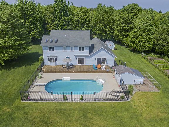 Incredible Home on 20 Acres in Fruitport! This sprawling traditional floor plan provides 4 bedrooms, 2-1/2 baths with over 2,400' of living space. Enjoy the bright and updated kitchen featuring natural quartz countertops, copious cabinetry and poolside access. Light and beautiful Hickory Frost Shaw flooring installed throughout. The master suite is filled with sunshine from the multiple skylights and gorgeous views of the pool. Notable extras include: main floor laundry, new sliders, new a/c, and new pool pump. Outside you will find a long private driveway leading to a two stall garage. Enjoy the wrap around deck with views of the beautifully landscaped yard. The acreage features a private pond stocked with fish, large fenced patio, heated pool & pool house. Enjoy this peaceful oasis!
