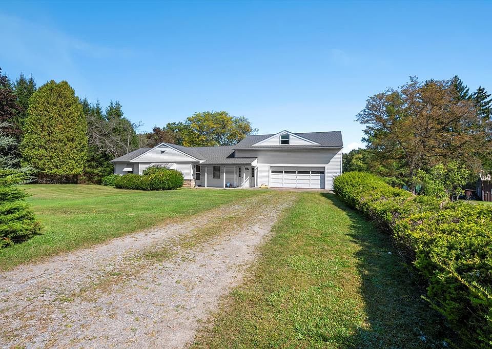 Charming 2 Bedroom, 2 Full Bath Ranch home with a versatile layout and room to grow! Enjoy the convenience of a 1-car attached garage with oversized storage above, plus a 1-car integral garage below. A brand new 2024 roof offers peace of mind, and hardwood floors lie beneath every room except the kitchen, waiting to be revealed. The full-footprint unfinished basement provides ample opportunity for additional living or storage space. Stay warm with a gas forced air furnace, and enjoy the option of a wood burner backup. The home operates on cistern water and a septic system. Solid plaster walls throughout add character and durability. Step onto the large covered back porch and take in your private 3-acre backyard—perfect for horses, livestock, or simply room to roam. A rare combination of country charm and functional living space awaits! 2023 gas hot water tank. New UV water light.
