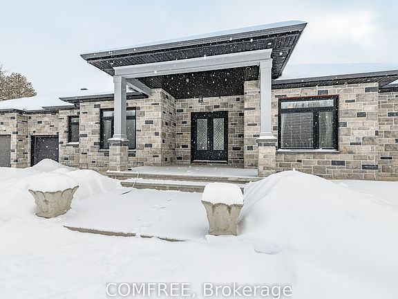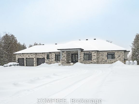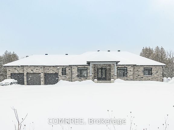 Welcome to an extraordinary executive stone-front estate bungalow with rear stucco, offering refined luxury, exceptional privacy, and timeless family comfort. Nestled at the end of a quiet dead-end street in prestigious Greely, this remarkable property enjoys no through traffic and no nearby neighbours, creating a serene, secure, and truly private country retreat. Set on a pristine, open, and highly visible 2.3-acre estate lot, this meticulously maintained 2,500 sq ft residence showcases quality craftsmanship and elegant exterior finishes. A stately U-shaped driveway enhances curb appeal while providing easy access, ample parking, and a grand sense of arrival. The home features a striking stone façade at the front, complemented by clean, modern rear stucco, creating a sophisticated and timeless exterior design. The main level has been thoughtfully designed for both luxury and livability, featuring three expansive bedrooms and three full bathrooms, with each bedroom offering its own private ensuite and dual closets. The primary suite is a true private sanctuary, highlighted by an impressive 14-foot floor-to-ceiling, Boutique style. custom cabinet closet. Entertain effortlessly in the separate enclosed dining room, perfectly suited for formal dinners, celebrations, or easily converted into a sophisticated home office or executive study. The partially finished lower level offers outstanding flexibility and is enhanced by large egress windows. Complete with a full bathroom, this level is ideal for a luxury recreation room, guest suite, or future expanded living space. Car enthusiasts and hobbyists will appreciate the exceptional 28' x 38' three-car garage, offering ample room for vehicles, storage, and a dedicated workshop. This one-of-a-kind executive estate offers the perfect balance of upscale living and unmatched privacy. A rare opportunity to own a private luxury retreat in one of Greely's most desirable and exclusive settings.