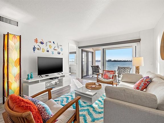 Nestled on the serene waterfront, this beautifully remodeled first-floor condo offers the perfect blend of modern elegance and coastal charm. Fully renovated in 2022, every detail has been thoughtfully upgraded, from the sleek new tile flooring throughout to the smooth, modern ceilings that replaced outdated popcorn textures. The kitchen has been completely transformed with raised ceilings, an open entryway, and all-new GE appliances, countertops, cabinets, sink, and fixtures. A newly installed pocket door creates a private guest bedroom with an en suite bath, while both full bathrooms feature brand-new vanities, fixtures, glass showers, and stylish tilework. Designed for comfort and security, the condo boasts hurricane-impact rear windows and sliders, plus electric hurricane shutters on every door and window—proven protection with no damage or water intake from the 2024 storms. This home features a keyless entry system and custom blackout and solar shades for the oversized sliding doors and windows which adds both privacy and energy efficiency. The end-unit location offers additional windows, enhanced privacy, and a peaceful atmosphere, with no stairs to navigate. Step outside to your private waterfront patio and enjoy breathtaking, ever-changing views—sip wine as the sun sets over the Don Cesar and the nearby beaches. The complex is quiet yet social, with friendly neighbors and amenities just steps away, including a heated and cooled pool, hot tub, and easy access to beaches, parks, dining, and services. With lower-than-average HOA fees and a truly unbeatable location, this condo is the perfect blend of luxury, convenience, and coastal living. HOA fees include exterior building maintenance, water, trash, sewer, cable, internet, building insurance and pool/ground maintenance. **Milestone and reserve study completed and passed. Assessments paid in full. No flooding or hurricane damage from 2024 storms**