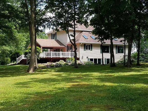Awe-Inspiring Two Story Contemporary Home resting on 9 acres of secluded paradise with breathtaking views of Powers Bluff and surrounding countryside! Inside the home you will find updated Kitchen with new vinyl plank flooring and quartz counter tops. Kitchen also features custom oak cabinets and island. Sunken Living Room with oak entertainment center and programmable gas fireplace make this a cozy place to relax or step out onto your sprawling covered deck and take in the views or wildlife. Back inside you also have a first floor laundry and an additional half bath. Upstairs you will have a master suite with large master bath consisting of a large walk-in porccelain tile shower, double sinks and walk-in closets. Two other bedrooms and additional full bath make up the remainder of the second floor. The lower level consists of large Rec room and Family room with large egress windows, which let in lots of natural light. Also another programmable gas fireplace to cozy up to. House can be heated with LP gas furnace or an outdoor wood burner, which can heat the house and shed.Outside you have a hot tub, fenced in backyard for your little friends, fenced in garden area and large 40 x 70 insulated and heated shed. The shed can be used for business or just storage, it has an office, bathroom and also a shop separated from the rest of the shed. All of this with lots of beautiful landscaping and black topped driveways make this a property you will want to call home! Call to schedule a showing Today!