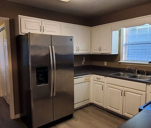 Step inside to an open-concept living area with luxury vinyl plank (LVP) flooring, seamlessly connecting the living room, kitchen, and dining spaces for a bright, airy feel. The kitchen is a standout with its modern touches, including a stainless steel refrigerator, black stove, and white dishwasher. The white cabinets add a fresh look, making this kitchen as functional as it is stylish.