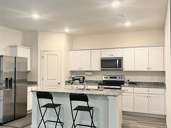 Open loftStainless-steel appliancesLow-maintenance flooringBright natural lightGranite countertopsModern kitchenWhite shaker cabinets