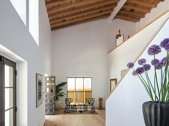 Located one block South of Sunset, this 5 bedroom and 8 bath home, designed by STANDARD Architecture is surrounded by olive trees, hand-laid basalt cobblestone, and a peaceful landscape. Once inside, white oak floors run throughout the home while steel case windows fill every room with light. A spacious living room features historic stained-glass windows, high-beamed ceilings, and a stone fireplace. In the master suite, a cedar, vaulted ceiling sits over French doors that lead into a forward-facing balcony. Dual master bathrooms feature luxurious slab marble and walk-in closets. The spacious backyard encloses a serene pool and lounge area. An extensive library is an ideal recreational space. Furnished with the latest appliances, the kitchen is replete with Calacatta Gold, wide windows, and French doors. Adjacent, an open formal dining room feeds into a wine-tasting/dining room and a modern, wine storage room.