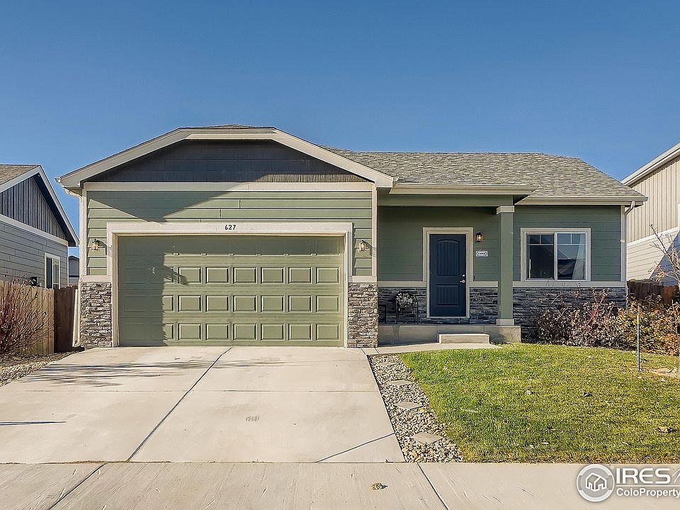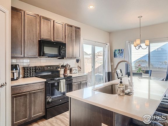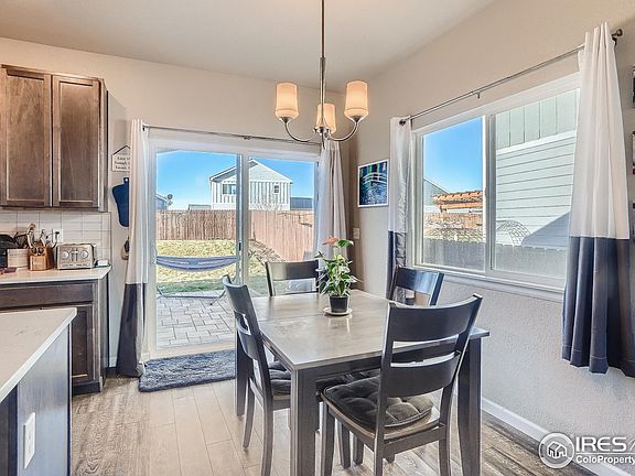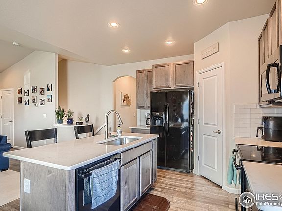 This 3 bed, 2 bath, move-in ready, four year-old ranch in Settler's Village has cathedral ceilings, white quartz counter tops and beautiful dark wood cabinets throughout. This home is designed for entertainment and ease of living. Some of the numerous upgrades include a large corner pantry in the kitchen, main floor laundry and epoxy flooring in the garage. The open floor plan seamlessly allows you and guests to move from the large kitchen island to the living room, then to the impressively large, fully fenced in backyard with an expansive paver patio. When your guests have gone home you can retreat to your primary bedroom boasting an upgraded bathroom with a large quartz countertop and floor-to-ceiling tiled resort shower and walk-in closet. The unfinished basement has a rough-in for a bathroom and room to expand. It's walking distance to the rec center and Milliken Pool. This neighborhood offers lovely walking trails, playgrounds and dog parks. It's time to call Milliken home!