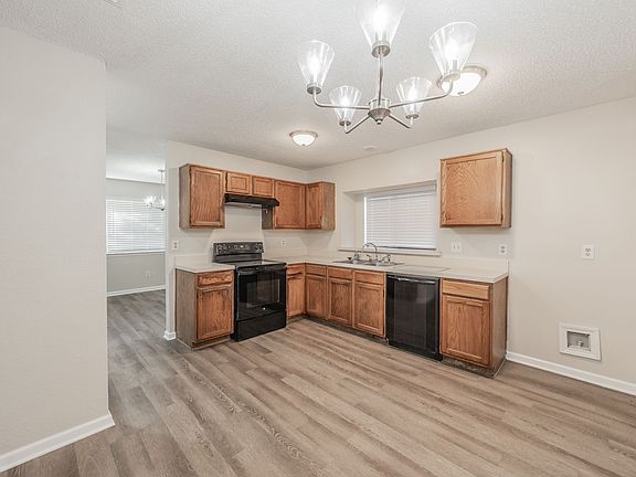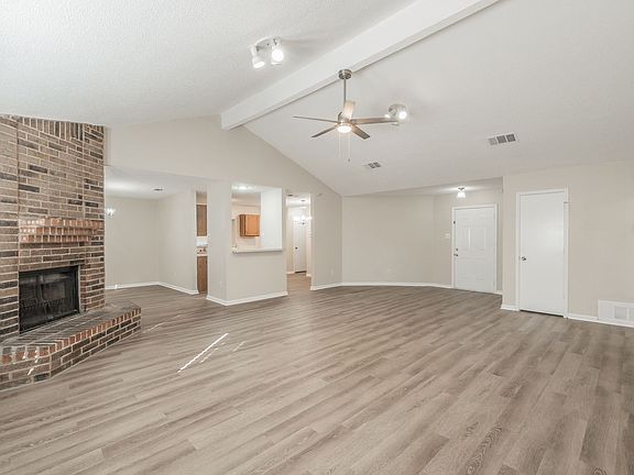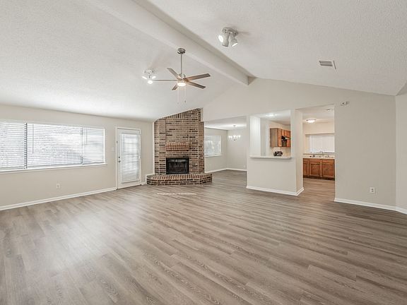 Enjoy a spacious living area featuring a beautiful brick fireplace, perfect for cozy gatherings. The nicely sized kitchen offers abundant cabinet space, complemented by fresh interior paint and new luxury vinyl plank flooring throughout. Updated fixtures and new doors add a modern touch to the home's charm. Step outside to a fully fenced backyard with an open patioideal for outdoor entertaining. A two-car garage provides added convenience and storage.