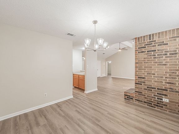 Beautiful brick fireplaceUpdated fixturesNew doorsFresh interior paintTwo-car garageFully fenced backyardAbundant cabinet space