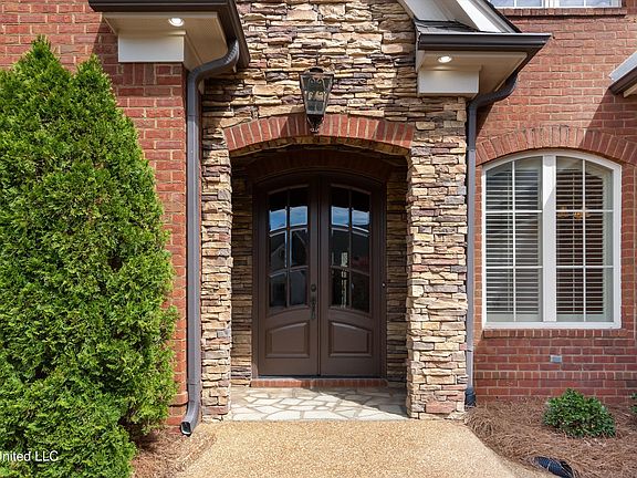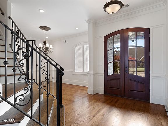 Step into timeless elegance with this French Country charmer, perfectly perched on the scenic Cherokee Valley Golf Course. From the moment you arrive, the rich brick and stone exterior, arched wood French doors, and manicured landscaping set the tone for the refinement that continues inside. The grand foyer welcomes you with intricate wrought iron stair railings, soaring ceilings, and stunning nailed-down hardwood floors that flow throughout the main level common areas. Crown molding and heavy millwork wrap every room in sophisticated detail—this is craftsmanship you can see and feel.