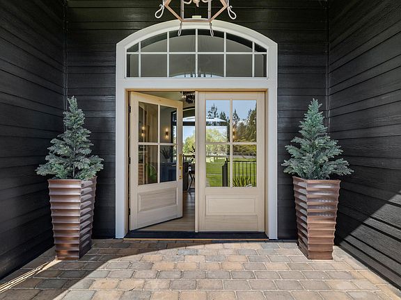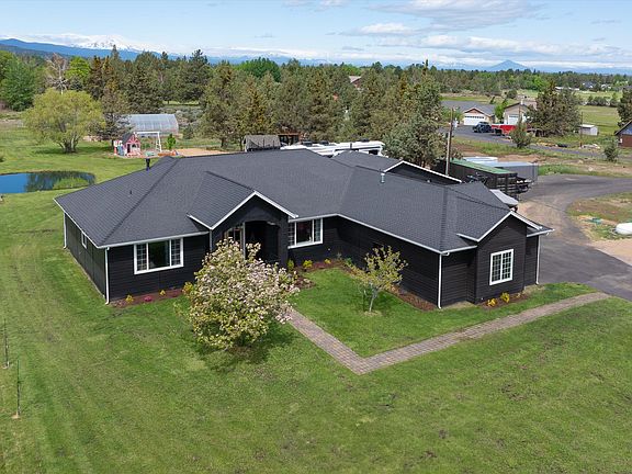 Stunningly renovated custom home on rare, flat 4.6 acres just minutes from town, including 3 acres COID irrigation. Single-level home offers 3/2 plus an office/flex space, w/ vaulted ceilings in the living room and primary suite. Enjoy Cascade Mtn and Pilot Butte views and a peaceful irrigation pond. Kitchen features high-end built-in appliances, large island, custom white oak cabinetry, quartz countertops & premium finishes throughout. The primary suite includes a soaking tub, oversized shower, double vanity, and walk-in closet. Recent upgrades include new cabinetry, garage doors, walkways, LVP flooring, interior and exterior paint, fireplace, built-ins, and custom wall finishes. The back patio is plumbed for a BBQ, fire pit, hot tub, and sauna ideal for elevated outdoor living. Fully fenced & gated w/ fruit trees, greenhouse w/ raised beds and auto watering, chicken coop, & outbuildings. Ample parking w/ RV hookups, attached 2-car garage, and detached 2-car garage/shop. Zoned MUA10.