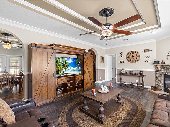 Wow! Beautiful custom 2018 Manufactured home loaded with upgrades! Features include a custom kitchen with wood cabinets, large island, granite countertops, stainless appliances & dry bar. Split floor plan with spacious primary suite offering tray ceiling, crown molding, huge walk-in closet & en-suite bath with double sink granite vanity and custom cabinetry. Great room showcases stacked stone fireplace, tray ceiling & crown molding. Drywall walls/ceilings, fresh paint, double-pane vinyl windows & Hardie board siding on the exterior. Enjoy the 40’ screened lanai with insulated roof, fans & lighting overlooking a serene koi pond and water feature. Property includes covered parking, a massive 40x50 detached garage with electric, industrial fans & 3 roll-up doors, plus RV carport, 50-amp & water hookup. Fully fenced & cross-fenced with vinyl privacy fencing and large gates. All on .61 acre. Ideal for car enthusiasts, RV owners, boaters or toy lovers! No Deed Restrictions, No HOA. Conveniently located near SR 50 with Great shopping and Restaurants.