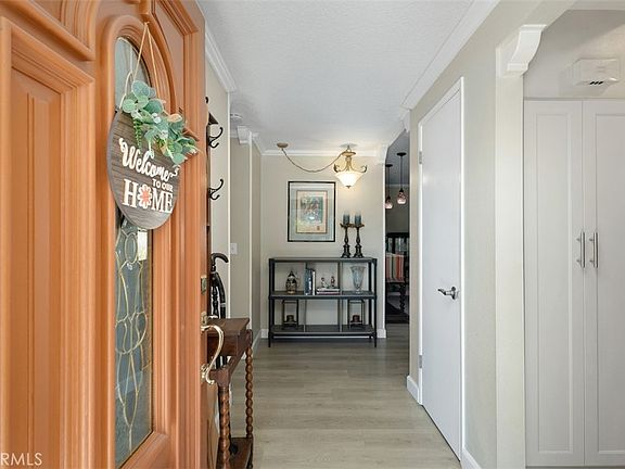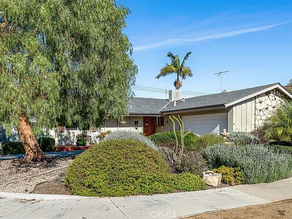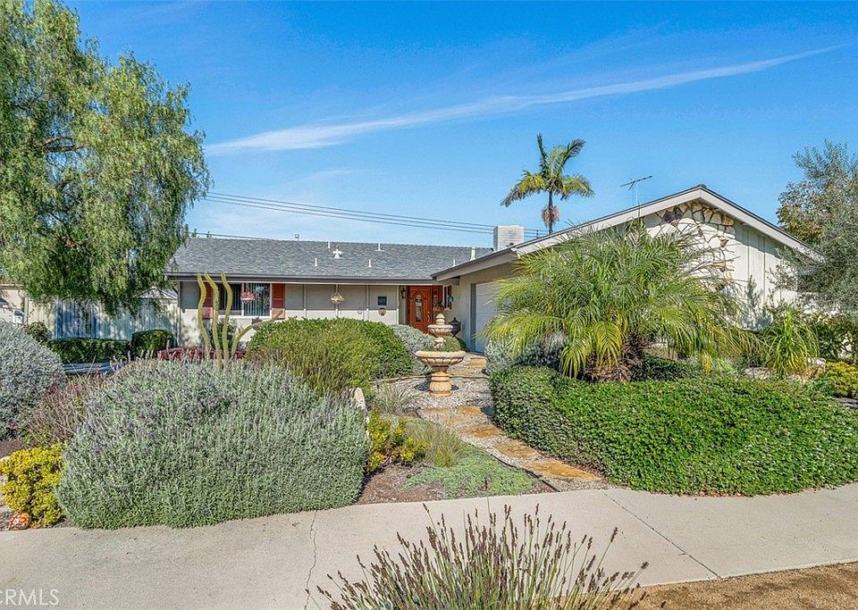 Prestigious beach home, situated on an over sized interior corner lot, while offering excellent curb appeal. It all begins with a renovated front yard, featuring a pavers driveway plus drought resistant landscaping with a fountain, a wooden deck and a picturesque mature tree. A new vinyl fence is also in the process of being installed shortly. As you approach the entry, you are welcomed by a Flagstone front porch and a custom front door with a pocket screen. Once inside, you are greeted by a spacious formal living room, featuring a gas or wood burning fireplace, stained glass windows and French doors leading to the rear patio. The kitchen has been updated in stages with granite counters, recessed lighting, updated cabinets installed in 2014 plus 5 year old stainless steel appliances, with the refrigerator and microwave included in the sale. There is a full sized dining room adjacent to the kitchen, showcasing a large garden window. The hall bathroom has been updated with a bathtub/shower with an acrylic surround plus glass enclosure, vanity with quartz counter and travertine flooring. All of the bedrooms are nice sized and there are mirrored wardrobe closets in the primary plus 2nd bedroom. The primary bathroom offers an acrylic lined shower, vanity with quartz counter plus a travertine tile floor. There are tons of bonus features including: crown moldings, textured ceilings, newer laminate flooring, dual pane windows, a brand new water heater, newer heating, air conditioning, ducting and insulation, all installed in 2021, copper plumbing, a roll-up garage door with a quiet opener and a 30 year roof with rain gutters, installed 11 years ago. Saving the best for last, the private rear yard features a heated in ground spa with an elegant brick surround, a large covered patio area with skylights, a natural gas built-in stainless steel BBQ, a large wrap around patio with a built-in gas firepit, French drains, artificial turf, nice landscaping and a garden shed. This lovely home is also walking distance to award winning schools, a park, golf, shopping, restaurants and is less than a 5 minute drive to the beach or the Bella Terra Mall!