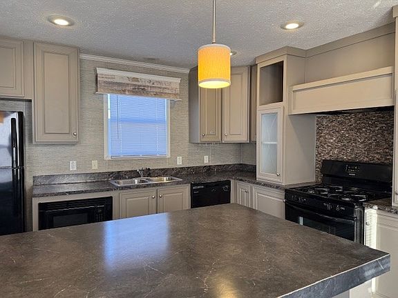 This 2018 Clayton home features two bedrooms, two bathrooms with a comfortable open layout. Home comes with refrigerator, stove, dishwasher, and a/c. This home has a large kitchen island. The home has a back covered porch with a stunning lake view.