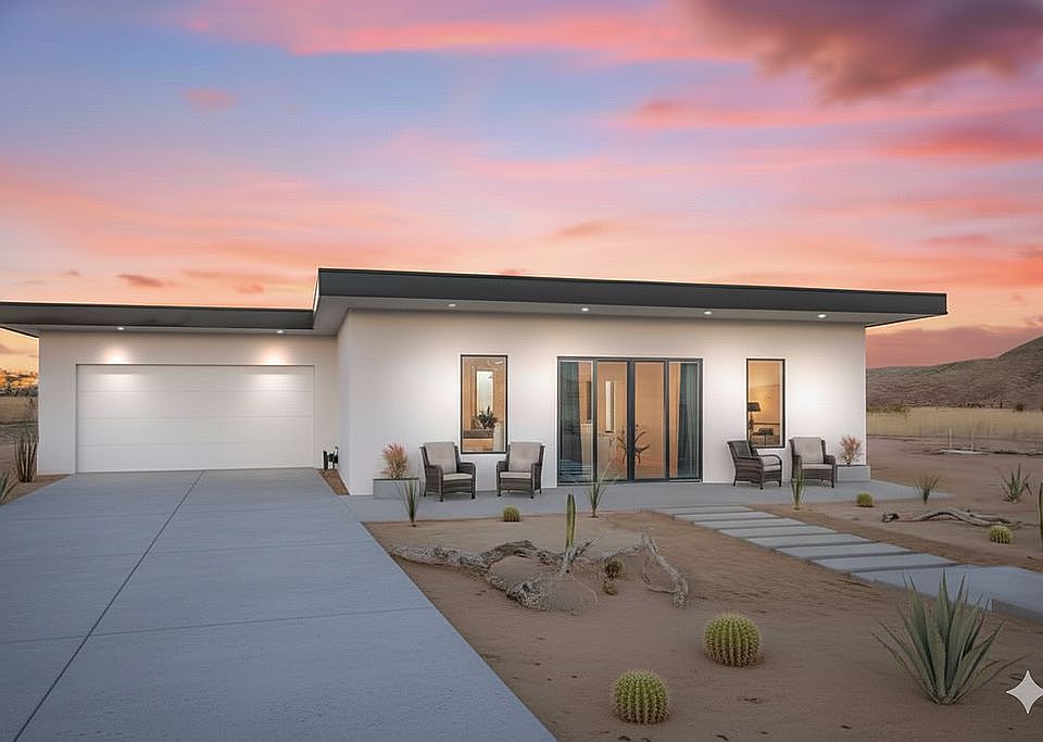 Experience the magic and beauty of Joshua Tree from this brand-new 1,050 sq ft modern home on 2.5 acres (108,900 sq ft) with endless desert and mountain views. Featuring 2 bedrooms, 2 baths, and a full 2-car garage, this home blends clean modern architecture with natural surroundings for true indoor-outdoor living.