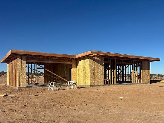 Currently under construction, estimated completion early 2026. Listing includes a rendering of the finished design, a floor plan, and framing photos. The opportunity to own a new-build retreat in this area is rare — secure your piece of the desert now.