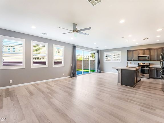 Modern elegance meets everyday comfort in this stunning 4-bedroom, 3-bath home with a spacious loft, located in a gated Northwest community. Thoughtfully designed, the floor plan features a convenient downstairs bedroom and full bathroom—ideal for guests or multigenerational living. The open-concept layout highlights quartz countertops, upgraded cabinetry, luxury vinyl flooring, and soothing neutral tones throughout. Custom paint, brand-new shutters, and ceiling fans in every room enhance both style and livability. All appliances are included, making it move-in ready from day one. Step outside to a private backyard with turf and low-maintenance landscaping, with no homes directly behind for added privacy. Perfectly positioned near the VA hospital, the 215 freeway, shopping, and dining—this home offers the perfect balance of sophistication, comfort, and accessibility in one of the Northwest’s most desirable gated neighborhoods.