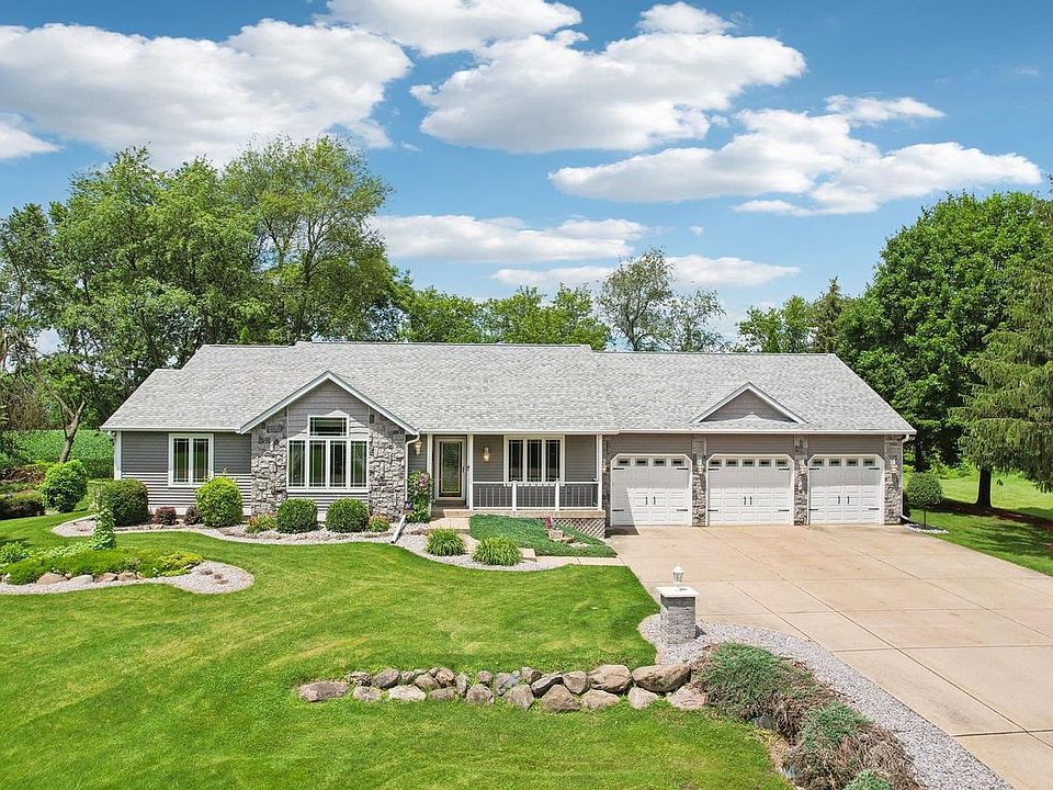 Custom built 1 owner home w/the convenience of town & the feel & setting of the country! This 3-4 bedroom, 3 bath ranch style home boasts plenty of extras including 6 panel doors, oak cabinetry, cathedral ceilings & skylights. The main bed/bath suite features walk in closets, a 3/4 bath & vaulted ceilings. The kitchen features stainless appliances, breakfast bar, movable island & a great workers triangle. Other main level features are a formal dining room that's currently an office, main floor laundry & a 3/4 bath/mudroom. The LL has a large rec room w/bar area, 3/4 bath, bonus room w/walk in closet & large storage area. A monstrous 6 car, heated 38x36 garage, no sidewalks to shovel, stupendous views/sunsets across the adjoining cornfield off the beautiful deck & stamped concrete patio.