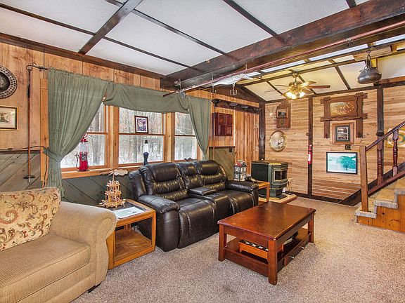 You'll love the setting of this private 5 acre parcel with lots of woods. The main floor of this home has a cozy living room with a pellet stove, a dining area, and open kitchen and a laundry area. Go up a few steps to the master bedroom with a large walk in closet. The full bath with a soaking tub is also on this level. Go up a few more steps to the 2nd bedroom, a 2nd full bathroom and 2 more bedrooms (neither of which have closets). There is a pole barn and a workshop with 2 lean to's. There is also an outdoor vermont wood stove that runs heat through the ductwork of the home and makes the home toasty warm. The seller rarely uses the actual furnace of the home.