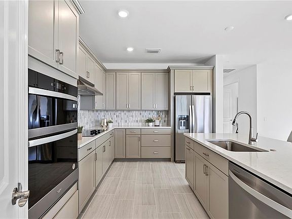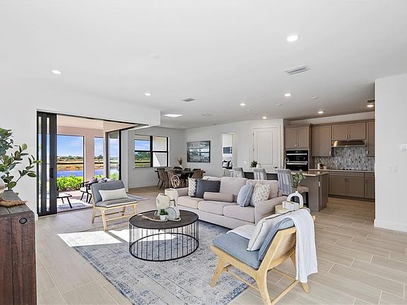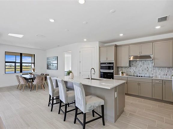 This Mystique floorplan offers 2 bedrooms, 2 bathrooms, a versatile den, and a spacious two-car tandem garage—perfect for additional storage, a workshop area, or even a golf cart. Designed with both function and elegance in mind, this home features an extended covered lanai with zero-corner sliding glass doors for seamless indoor-outdoor living and is pre-wired for an outdoor kitchen and pool or spa. The owner’s suite is a true retreat, showcasing an oversized walk-in shower with upgraded tile and frameless glass. The kitchen boasts built-in appliances, gray cabinetry paired with quartz countertops, and 12"x24" tile flooring that flows throughout the home. Additional upgrades include a full laundry room with cabinetry, countertops, and a sink; 8-foot interior doors; 5" upgraded baseboards; impact windows; a tile roof; and epoxy-finished garage floors. Located in Del Webb Naples, a premier 55+ resort-style community, residents enjoy access to over 30,000 square feet of amenity space across two stunning clubhouses: The Oasis Club and Grand Hall. The community is home to an 18-hole championship golf course (optional membership), two resort-style pools including an 8,000 sq. ft. beach-entry pool and a lap pool, a fitness center, movement studio, golf simulator, fire pit lounge, and The Rusty Putter Bar & Grille. Outdoor enthusiasts will love the 12 lighted pickleball courts, tennis courts, bocce ball courts, community garden, and miles of walking and biking trails. With a full calendar of events—including game nights, fitness classes, arts & crafts, and social gatherings—Del Webb Naples offers an unmatched lifestyle designed for relaxation, recreation, and connection. Live the active adult lifestyle you’ve dreamed of in a beautifully upgraded new home. Photos are from a furnished model. Options for this home may vary.