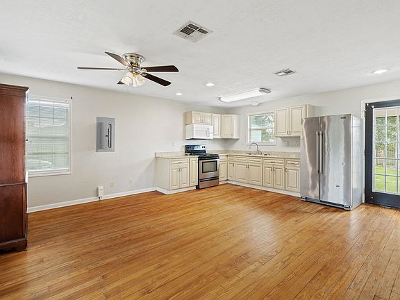 Explore this charming two-bedroom, one-and-a-half-bath home offering 778 square feet of thoughtfully updated living space with its convenient location close to downtown. Step inside to find a bright open floor plan that blends living, dining, and kitchen areas with beautiful wood floors and plenty of natural light. The fresh interior paint throughout creates a clean, inviting feel, and the layout maximizes every inch of space for comfortable everyday living. The kitchen has been completely refreshed with updated cabinetry, granite countertops, and stainless-steel appliances including an electric range and refrigerator. A dedicated laundry room offers added functionality with overhead storage. Both bathrooms have been modernized from top to bottom with stylish new fixtures, updated vanities, and a sleek tub-shower combo that gives the space a like-new appearance. The half bath off the hallway adds convenience for guests and daily living. Outside, the home sits on a well-kept lot with a spacious fenced backyard and mature shade tree — ideal for entertaining, relaxing, or creating your own outdoor retreat. The covered front porch offers a welcoming entry and space to enjoy quiet mornings or evenings. The property features vinyl siding for easy maintenance and a concrete driveway for off-street parking. Important updates provide peace of mind, including a roof and central HVAC system replaced in 2020. The home is located in Flood Zone X, meaning no flood insurance is required. Whether you’re a first-time homebuyer, downsizing, or an investor looking for a turnkey rental, this property is an excellent opportunity. With its manageable size, efficient layout, and move-in-ready condition, it offers the perfect balance of affordability, convenience, and comfort. The seller reserves Lake Charles Title for closing. Schedule your private showing today to experience this beautifully updated home and see why it’s a smart choice for anyone seeking value and location in the heart of Lake Charles. Seller will also owner finance with 10 percent down payment.