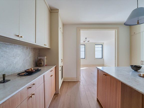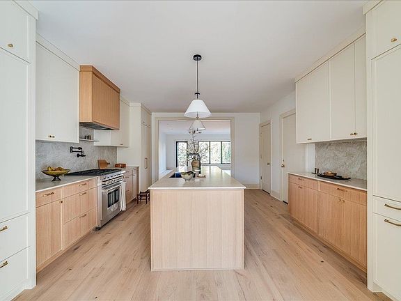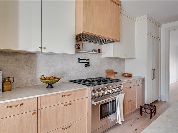 The state-of-the-art kitchen is a chef's dream, equipped with a Sub-Zero Wolf appliance package, direct outside venting, under counter lighting, a Bosch panel-ready dishwasher, and breathtaking Taj Mahal honed quartzite countertops and backsplash. Stylish pendant lights illuminate the custom white rift oak and matte lacquered cabinetry.
