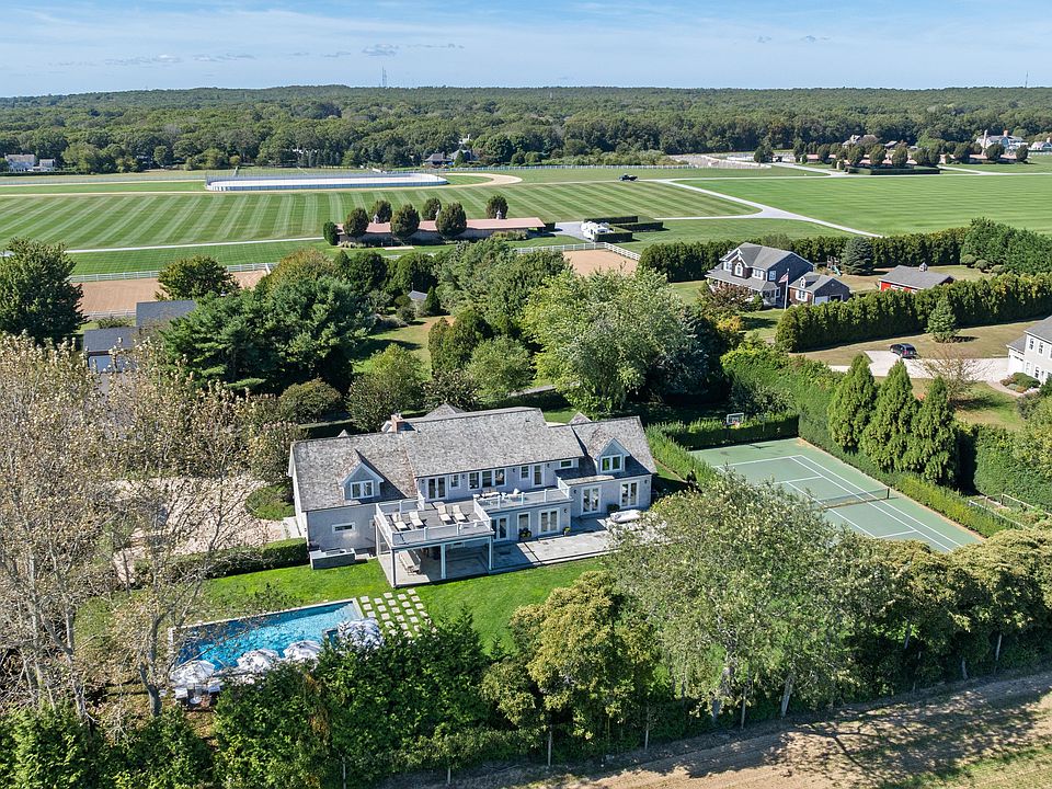 Enter into timeless elegance and modern luxury in this beautifully designed 6,326+/- sq. ft. estate, set on 1.2 lushly landscaped acres surrounded by picturesque farm fields. A private electric gate welcomes you to this exceptional property, where a grand double-height foyer opens to rich hardwood flooring, dual coat closets, and elegant living and entertaining spaces. The first level features an en suite guest bedroom, a formal dining room, a stylish powder room, and a light-filled living room with soaring ceilings, a gas fireplace, and French doors leading to the patio. The open-concept kitchen is a chef's dream, boasting a 6-burner Wolf range, Sub-Zero refrigerator/freezer, Bosch dishwasher, dual sinks, an oversized marble island, and abundant cabinetry, seamlessly connected to a cozy family room with French doors to the backyard. A dedicated bar area with a wine cooler and a walk-in pantry with garage access complete the main level's thoughtful layout. Upstairs, the primary suite offers a private sanctuary with a balcony overlooking open fields, a massive walk-in dressing room, and an opulent en suite bath with a steam shower, soaking tub, makeup vanity, dual sinks, and a separate water closet. Three additional guest suites each feature their own private bathrooms, including one with a balcony and another with a tub-ideal for family or long-term guests. The lower level expands your living space with a cedar wine closet, a gym, a generous recreation area, a guest bedroom with an en suite bath, a full bathroom, a utility room, and a laundry room equipped with LG washer/dryer and utility sink. French doors provide easy access to the outdoor grill area, perfect for casual entertaining. Outside, this property truly shines. The fully fenced backyard offers a private oasis with a heated Gunite pool, attached spa, and a bluestone patio for lounging. Enjoy al fresco dining under the covered patio, featuring an outdoor kitchen equipped with a built-in grill, pizza oven, and ice maker. Host summer soirées with ease in the open patio and expansive yard, or take in a friendly match on the tennis court with basketball hoop. With a 2-car attached garage, ample driveway parking, and a serene farm-field backdrop, this 2012-built estate is a rare find that balances luxurious living with relaxed Hamptons charm.
