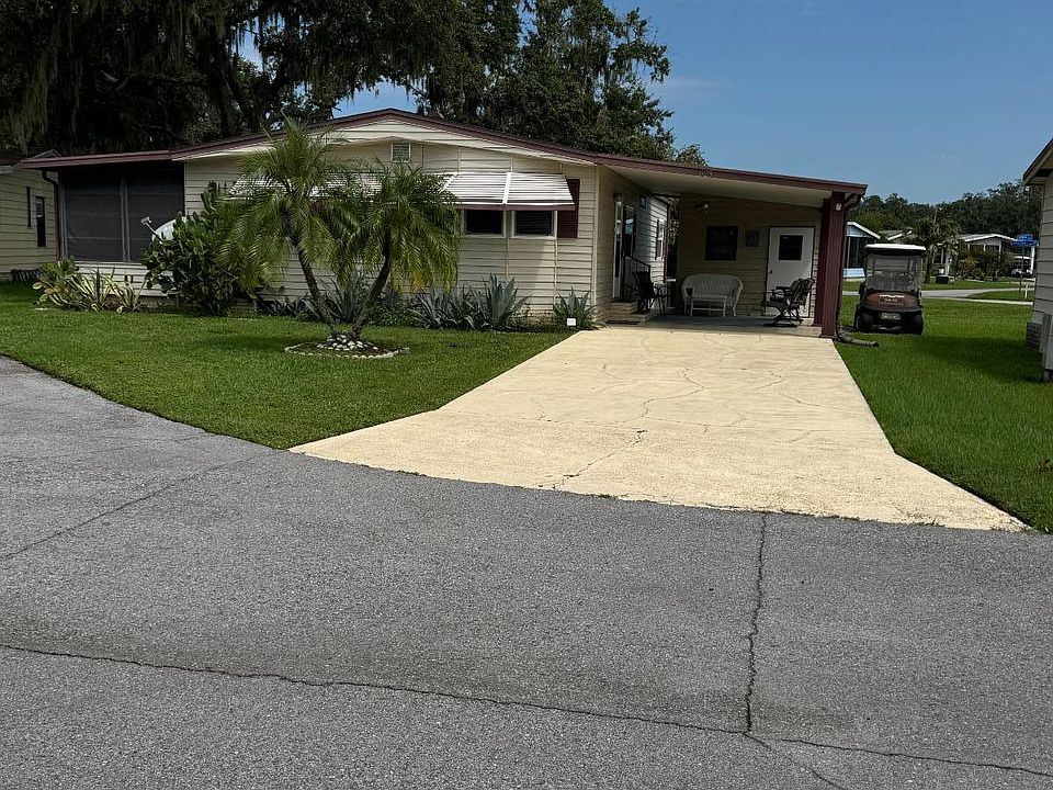 This well-maintained 2-bedroom, 2-bath home offers 1,255 sq. ft. of comfortable living space and comes fully furnished, plus a golf cart, making it truly move-in ready. The open floor plan features beautiful flooring throughout and a spacious kitchen that opens seamlessly into the living area. An enclosed porch with A/C piped in adds extra comfort and living space, perfect for relaxing year-round. Inside, you'll find a washer and dryer conveniently located within the home. The master bedroom is generously sized to accommodate a king-size bed with room to spare, while the second bedroom is also large, with both rooms offering walk-in closets for ample storage. Additional features include double insulated windows, large shed, abundant storage throughout, and a wide driveway that can accommodate up to six cars. Recent upgrades include a brand-new roof and A/C ductwork installed less than a year ago, ensuring peace of mind for years to come. Lot Rent is $972.00 until 12/31/2025 Lot Rent Includes Water. Trash. Taxes As part of a vibrant Pet Friendly community, you will enjoy all the amenities two swimming pools, 2 clubhouses, with community activities. Fishing. Tennis, Pickleball, Game room, Fitness Center. Horseshoes. Library. Picnic Area. Putting Green. Shuffleboard. and access to the golf course there is a fee for golf course. you must talk to the pro shop for details. Don't miss out call for a showing today!!!