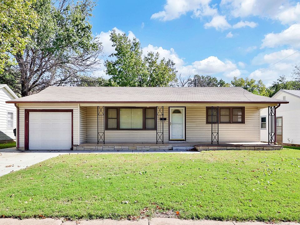 Beautiful home located in the Prairie Park Addition of southeast Wichita. This home is a three bedroom, one bathroom, one car garage with easy access to highways, schools and shopping. The front of the property has great curb appeal and an enormous 35' covered patio, with custom stonework and planter box. There is a lot of new cement work done to half of the extra wide driveway and sidewalk going to the front door and around to the backyard. There is a spacious backyard with a 16'x16' deck, a patio, large 13'x12' shed with cement floor and electricity, and a nice privacy fence. In the home, there is a large living room and eat in kitchen. There is a large picture window to allow for natural light and a view of the front yard. In the kitchen there is a vaulted area with chandelier creating a custom feal. Bedrooms are a good size and allow for natural light. HVAC is newer Amana unit that is oversized for the property. 2019 Water heater 50 gallon. Updated GE breaker panel. This home is well taken care of and ready for a new family. Feel free to set up your private showing today.