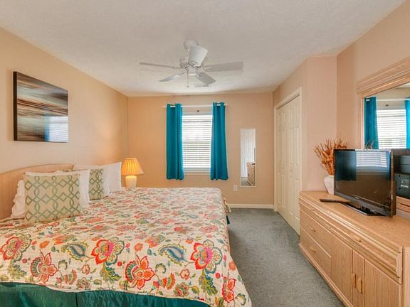 In the master bedroom, there is a king-size bed with a flat-screen television and an ample amount of space for your belongings. The master bathroom has a spacious white vanity area and a private bath/shower. In the second bedroom, there is a double-size and twin-size bed. The second bathroom is located right outside of the second bedroom and has a bath/shower combo too. This unit has a washer and dryer! Waterway Village 20-F can accommodate up to five guests.