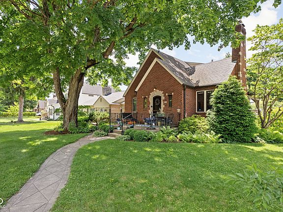 Welcome to the Tulip House - A Warfleigh Classic! This iconic all-brick Tudor is known for the hundreds of tulips that bloom each spring - but it's what's inside that truly sets it apart. The main floor features two bedrooms and a full bath, along with a stunning living room with vaulted ceilings, exposed wood beams, and a wood-burning fireplace. The original hardwood floors carry throughout, leading into a formal dining room and a custom kitchen with upgraded appliances and thoughtful finishes. Upstairs, you'll find two more bedrooms and a full bath, complete with custom blinds with blackout shades for extra privacy and comfort. The finished basement offers a spacious family room with a second fireplace (gas), new carpet, a half bathroom, and a warm, inviting space for movie nights or entertaining. The home has been freshly painted throughout, and includes a new fridge, washer and dryer, and a reverse osmosis water system - all installed within the past two years. Electrical outlets were updated in 2025, and the professional landscaping includes a full restoration of native plants, creating a private courtyard oasis perfect for outdoor living and entertaining. Located near Broad Ripple Village, Marott and Holliday Parks, the Monon Trail, and the Canal Tow Path, this home offers the perfect blend of nature, neighborhood, and timeless style.