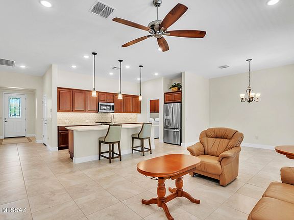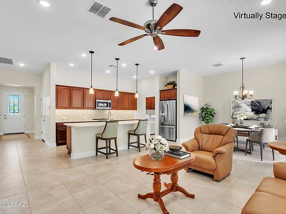 Enjoy stunning Catalina Mountain views from this beautifully upgraded 2019 VIVA model villa in SaddleBrooke. This 2-bedroom, 2-bath home with a den/office sits on a premium south-facing lot backing to a natural wash for added privacy. The stylish kitchen features quartz counters, stainless appliances, and upgraded cabinetry, seamlessly connected to the great room with custom built-ins. Both bathrooms include upgraded tile showers; the primary suite also offers a double vanity and walk-in closet with shelving. Outdoor living shines with an epoxy-coated covered patio extended with travertine pavers, pony wall, and water runoff design. Garage includes built-in cabinets and epoxy floor. Move-in ready villa living!