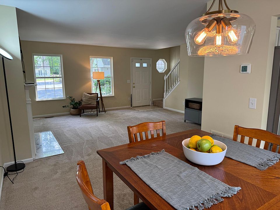 Inside, all new carpet and fresh paint as well. The front living room offers a cozy fireplace and flows seamlessly into a spacious dining area. Head into the kitchen and you'll find a well-equipped space with a convenient bar opening into a dramatic two-story great room, anchored by a wall of windows that floods the space with natural light.