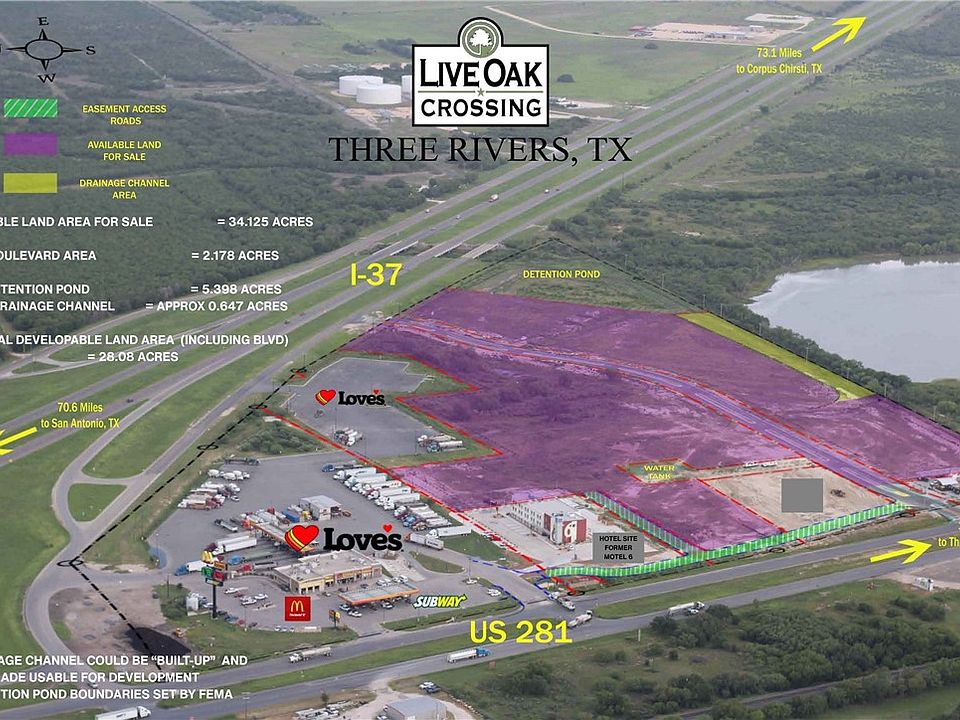 Approximately 28–34± acres of commercial land located at the hard corner of I-37 and SH-72 / FM-286 (Live Oak Crossing) in Three Rivers, Texas. This site offers a rare opportunity to acquire large, contiguous acreage with excellent interstate visibility and access along one of South Texas’ primary north–south corridors connecting San Antonio and Corpus Christi. Utility infrastructure in place. The property is located in the extraterritorial jurisdiction (ETJ) providing broad zoning use for a wide range of commercial, retail, industrial, logistics, travel center, or mixed-use development strategies. The size and configuration of the tract allow for multiple development scenarios, including phased development, pad sites, or single-user occupancy.