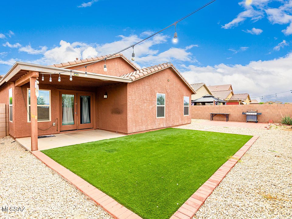 3D Matterport & Floor Plan available at Homes.com. Offering 3 beds, 2 baths, 2-car garage, & a desert front yard. The inviting interior showcases abundant natural light, a designer palette, tile flooring in common areas, and plush carpet in bedrooms. You'll love the spacious, seamlessly flowing open layout paired with French doors to the back! The kitchen boasts SS appliances, a pantry, recessed lighting, ample espresso cabinetry, and an island w/breakfast bar. The versatile den is perfect for an office. The main bedroom has a walk-in closet & an ensuite w/dual sinks. If you want to relax or enjoy BBQ, the backyard awaits! A covered patio, well-laid pavers, & artificial turf complete the picture. No neighbors behind, adding extra privacy plus mountain views!