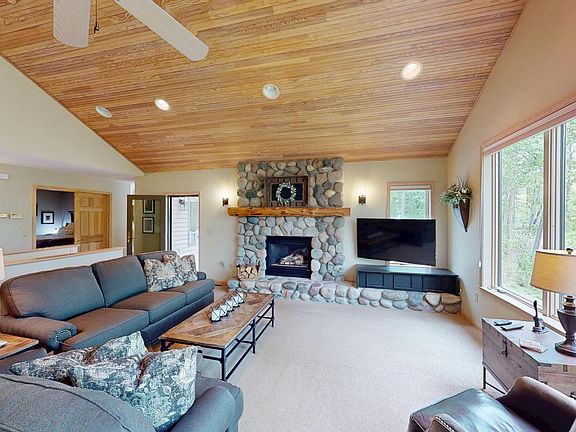 Step into this immaculate custom home, perfectly situated with stunning panoramic views of the golf course from both the main and lower levels. Soaring cathedral ceilings and a beautiful stone fireplace create a warm and inviting ambiance in the great room. The main-floor primary suite offers comfort and convenience, while the walk-out lower level is ideal for entertaining with a spacious family room, second fireplace, and a full wet bar. This home combines luxury and lifestyle—perfect for those who love to relax or entertain in a truly scenic setting. All this in beautiful Michaywe. Indoor and outdoor pools, beach house on Opal Lake and year round activities