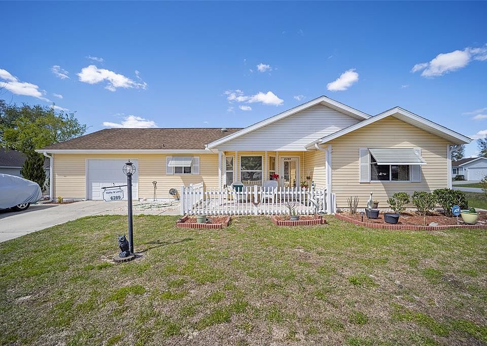 Don't wait too long to view this lovely well maintained home in Marion Landing. This light and bright home features: 2 bedrooms (both with walk in closets), 2 baths with new sinks and faucets, 1.5 car garage with parking pad for additional parking, galley kitchen with breakfast nook, spacious living room, dining area, large inside laundry room with great storage space, tile and laminate floors (no carpet), enclosed lanai, picket vinyl fence in the backyard which is perfect for your pets, sitting area with picket vinyl fence at front entry and located on a corner lot with mature landscaping. Marion Landing has a very low HOA of 127/mo which includes water, sewer, trash and offers great amenities; including a bowling alley, club house, pool, tennis courts, etc. Roof replaced in 2012, newer hot water heater, newer garage door opener, some windows replaced in 2021 and washing machine replaced in 2020, Temper Guard insulation and water softener. This is a must see; call today to schedule your private tour.