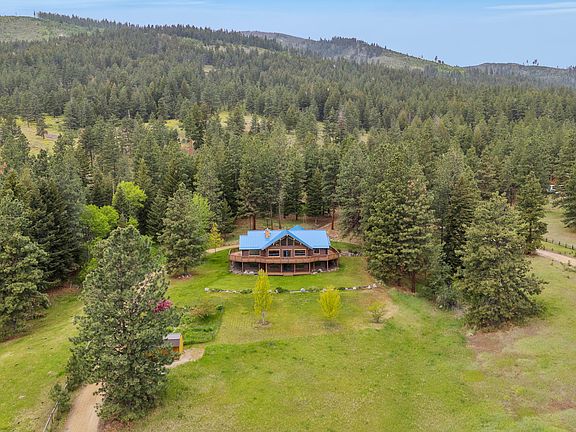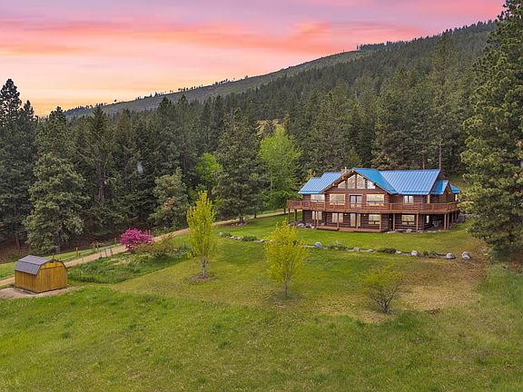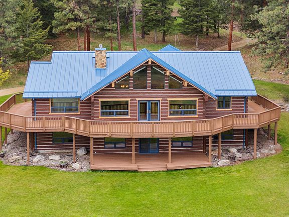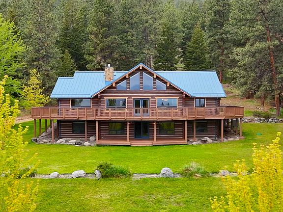 Luxury, privacy, and panoramic views define this exceptional Dovetail custom log home set on 20 irrigated acres in the heart of the Bitterroot Valley. Crafted with premium materials and meticulous attention to detail, this property delivers high-end comfort along with Montana charm. You enter through a custom etched front door into a cathedral ceiling great room with a wall of windows displaying incredible mountain views from every area of the living room, dining room, and kitchen. The gourmet kitchen features granite countertops, handcrafted custom cabinetry, and professional grade Viking range and refrigerator. The spacious living area centers around a beautiful gas fireplace with natural rock detail, creating a warm, inviting space. A large wraparound deck extends the living space outdoors, perfect for relaxing or entertaining and taking in the grandeur of the Sapphire Mountains, the serenity of the Bitterroot Valley, and scale of the Big Montana sky. The main floor primary suite offers a serene retreat with large windows, a spa-inspired en suite and a spacious walk-in closet. On the opposite side of the main floor, there are Jack-and-Jill bedrooms that provide functional convenience along with a dedicated home office, guest bathroom, and a finished attic storage area. Downstairs features a spacious fully finished, walkout basement with plenty of natural light, a comfortable living area, two additional large bedrooms, a full bathroom, and ample storage space.