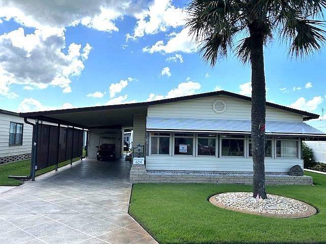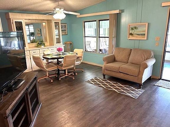 This well-maintained 2-bedroom, 2-bathroom home offers 1,176 sq. ft. of living space plus an additional 200 sq. ft. windowed and air-conditioned lanai-perfect for relaxing year-round. The home features many recent updates including a 2020 water heater, new windows, updated plumbing, newer siding, and a brand-new dishwasher. Inside, you'll find a spacious layout with vinyl plank flooring, walk-in closets, and the convenience of indoor laundry. The home comes completely furnished and move-in ready. Additional highlights include: Two storage sheds for extra space one can be used as a hurricane shelter. Large covered driveway Golf cart included Located in a desirable 55+ community, this home combines comfort, modern upgrades, and convenience for easy Florida living.