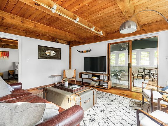 This recently renovated, sun-filled post & beam cabin offers the perfect balance of rustic charm and modern convenience. Situated on a quiet road with seasonal views of the surrounding hills and countryside, the home features an open floor plan with three bedrooms and two bathrooms. The spa-like upstairs bathroom includes a soaking tub and double vanity, while the lower-level bathroom offers a generously sized walk-in shower for everyday comfort. Large picture windows and exposed beams create a warm, sun-filled interior, fully furnished with a mix of rustic and contemporary pieces. The fully equipped kitchen comes stocked with cookware, tableware, and basic staples, with fresh linens and towels also provided. A washer and dryer are located in the basement for added convenience. Central heating and air conditioning, managed by a Nest thermostat, ensure year-round comfort. The wooded hillside lot provides privacy and a peaceful setting while offering proximity to major Hudson Valley highlights. The property is under two hours from Manhattan, making for an easy weekend commute. For winter sports enthusiasts, the home is less than 30 minutes from Catamount Mountain, and about 45 minutes from both Mohawk Mountain and Butternut ski areas. Acclaimed dining at Stissing House is just five minutes away, with additional restaurants, breweries, trails, and cultural attractions within easy reach. Available from Nov 1-June 1, with a one-month minimum stay.